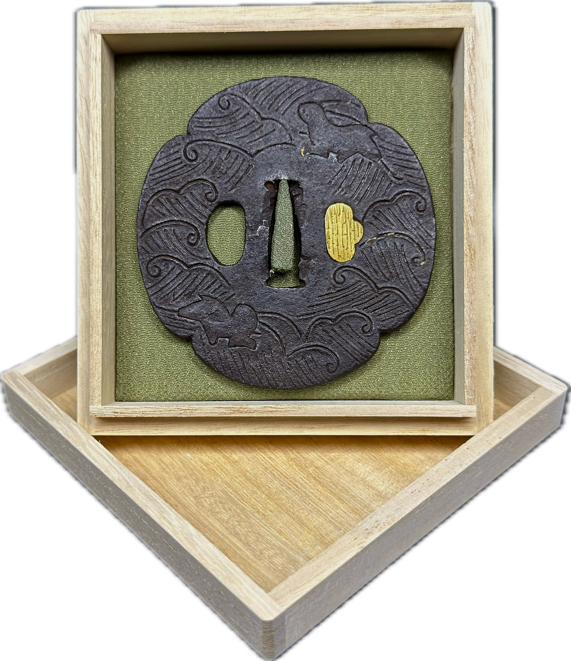 Tsuba, Iron w/ Gold Umegane, Mokko Gata, 83.7mm x 87.7mm x 8mm (Antique) w/ Kiri-bako (桐箱)